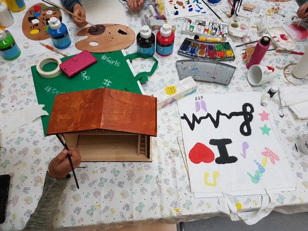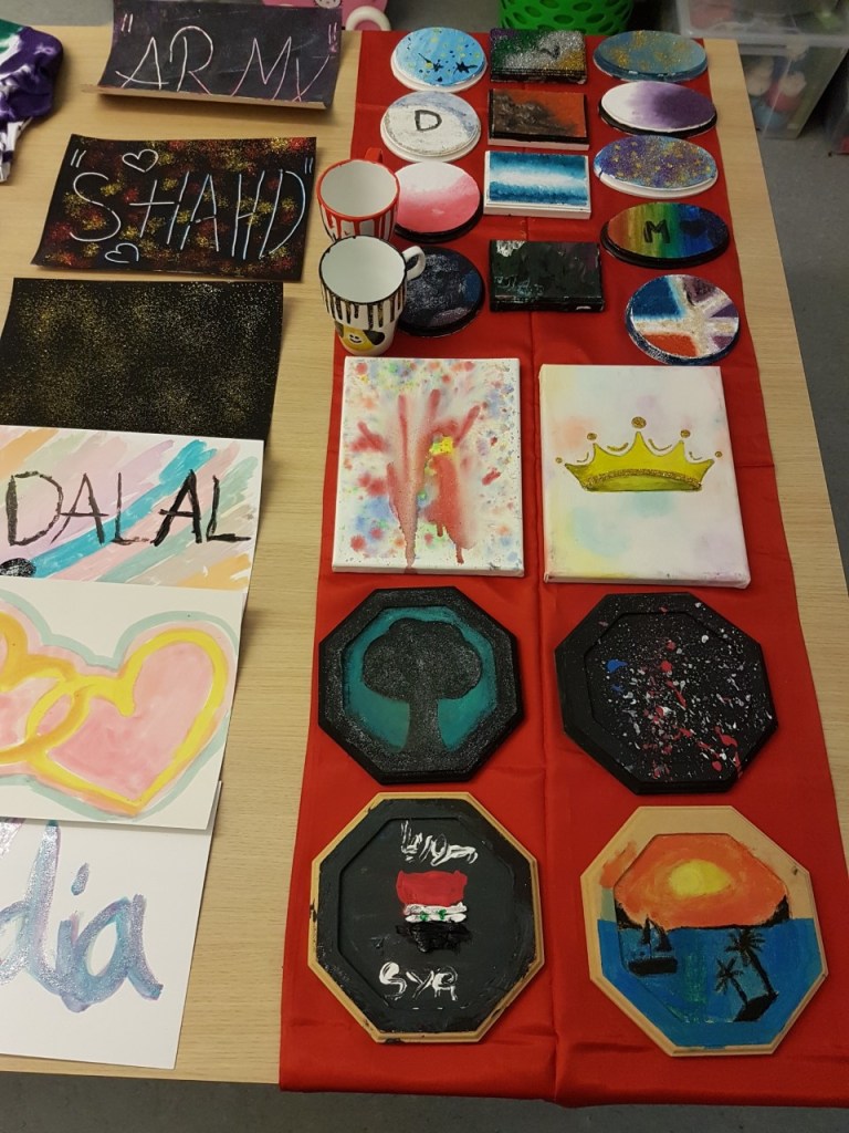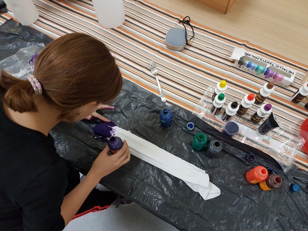 Vi har bl.a. lavet indkøbsposer og farvet gamle t-shirt med batikmønster 🙂
